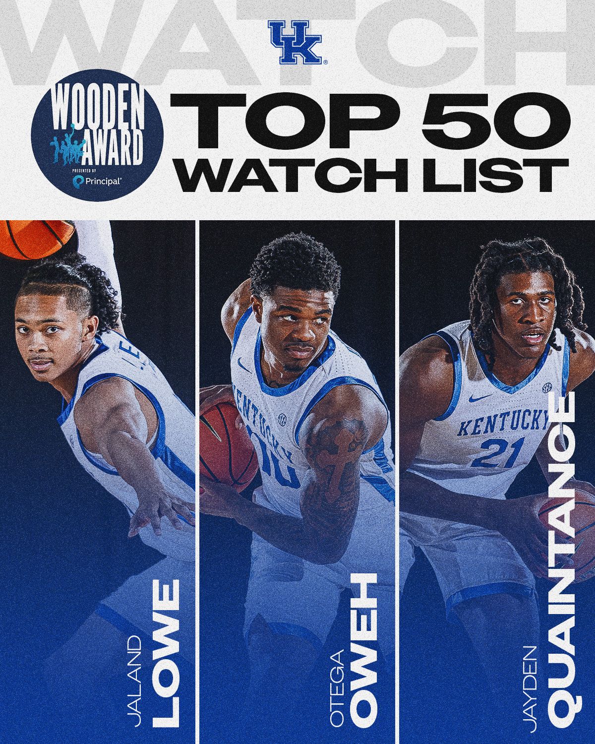 Triple Threat. The men’s basketball team has three players on the Los Angeles Athletic Club’s John R. Wooden Award Preseason Top 50 watchlist: Jaland Lowe, Otega Oweh and Jayden Quaintance. Kentucky is just one of four schools with at least three representatives on the list. The award recognizes the most outstanding individual player win men’s and women’s college basketball.