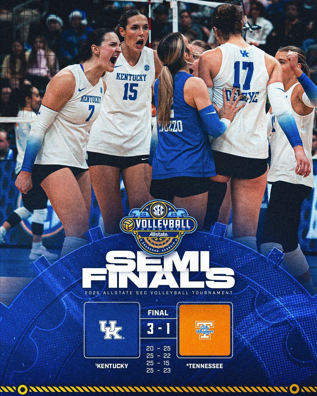 🔼 We Made It! The volleyball team beat Tennessee 3-1 on Monday night to advance to the SEC Championships. The Cats had 70 digs and nine total blocks. Brooklyn DeLeye recorded a double-double with a team-high 22 kills and 10 digs. Eva Hudson was right behind with 18 kills. Kentucky will face either Texas A&M or Texas tonight at 7pm ET.