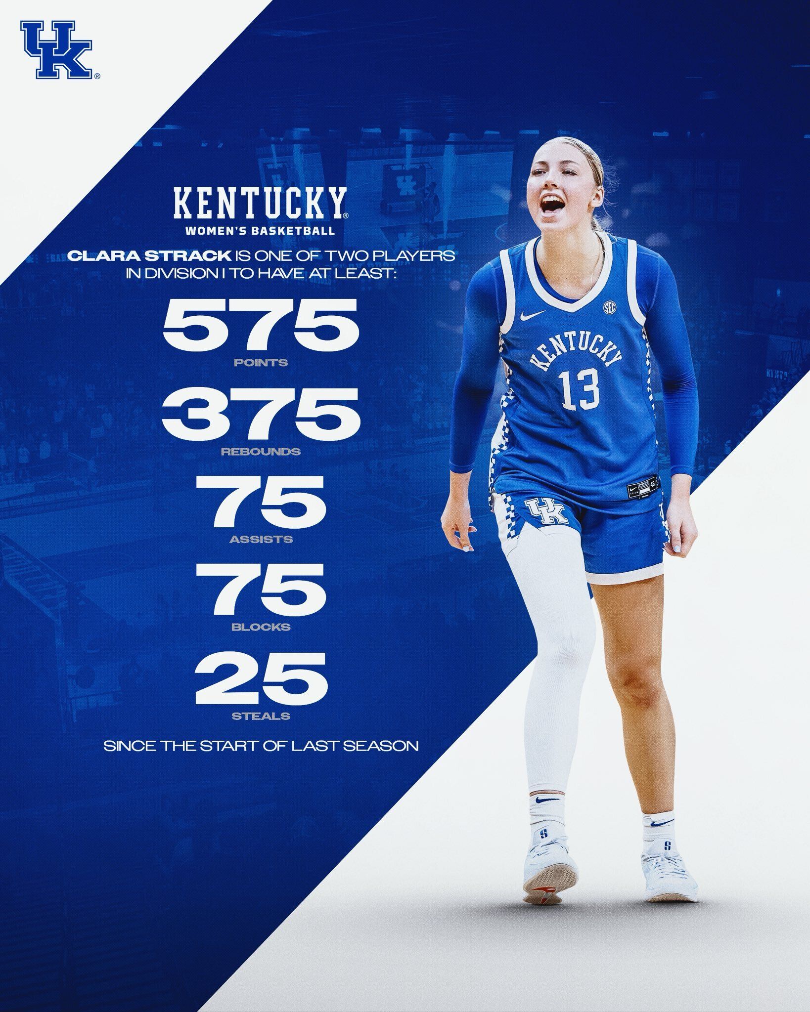 Talkin’ Stats. The women’s basketball team has some stats that they would like to share. To start, let’s talk about Clara Strack. Strack is one of two players in Division I to have achieved the above stats since the start of last season. Next, the team as a whole. Kentucky has climbed four spots in the AP Top 25 weekly ranking to No. 16.