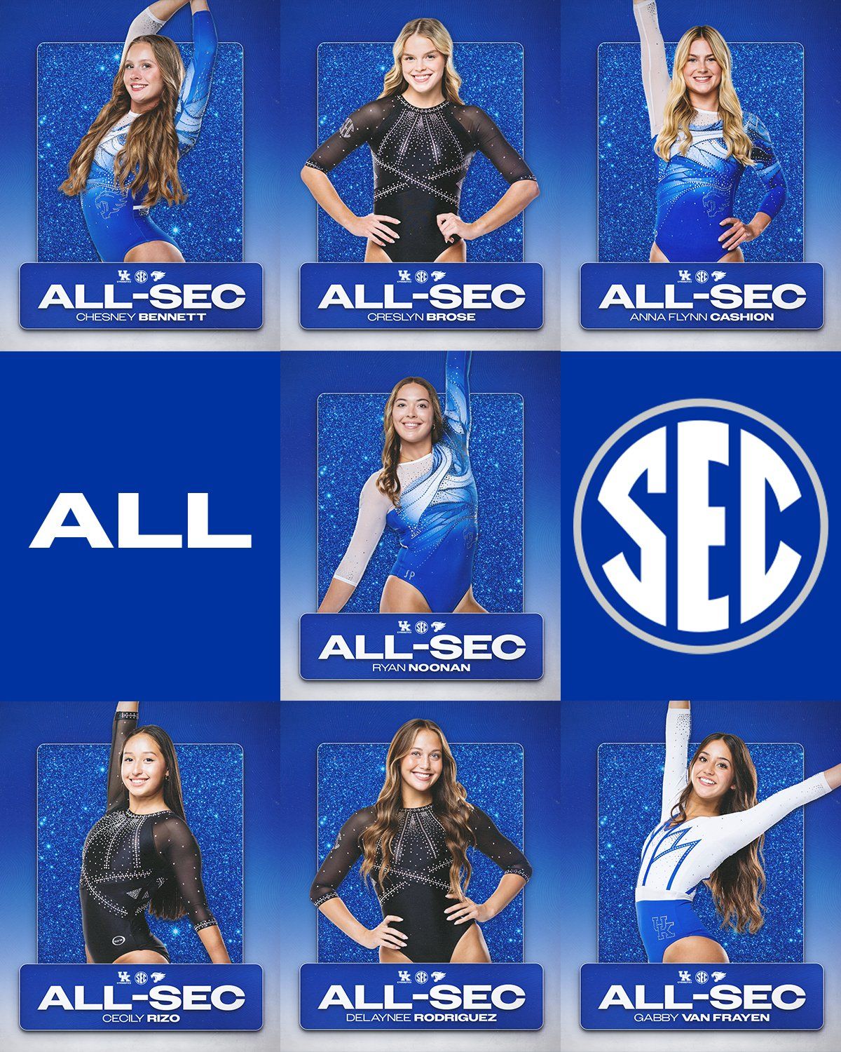 Lucky 7. The gymnastics team had seven athletes earn 2026 All-Southeastern Conference Team honors. Chesney Bennett, Creslyn Brose, Anna Flynn Cashion, Ryan Noonan, Cecily Rizo, Delaynee Rodriguez, and Gabby Van Frayen were named to their first All-SEC team in their careers. The All-SEC Team is comprised of the student-athletes with the top four scores (including ties) on each event and in the All-Around competition in the first session and the second session of the SEC Championships.